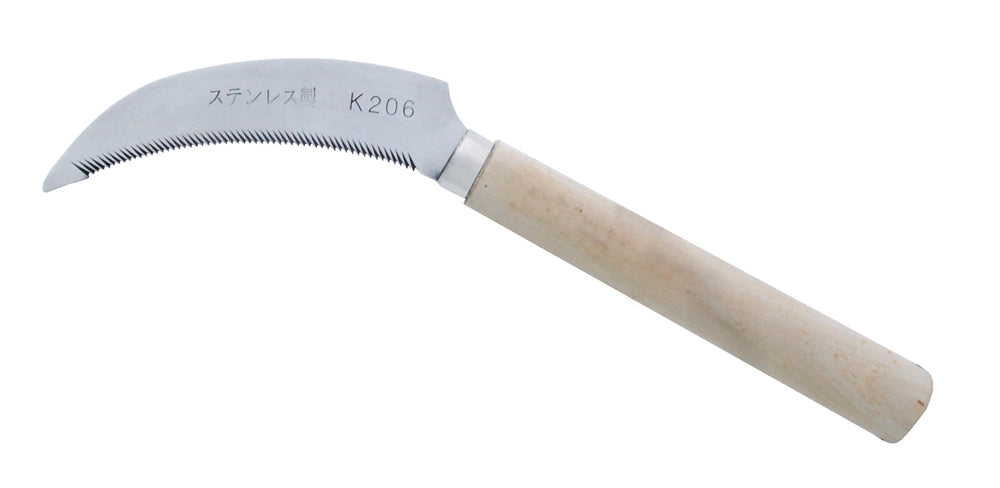 4.3" stainless steel blade sickle with light serration on the blade and a wooden handle. Also called a berry knife.