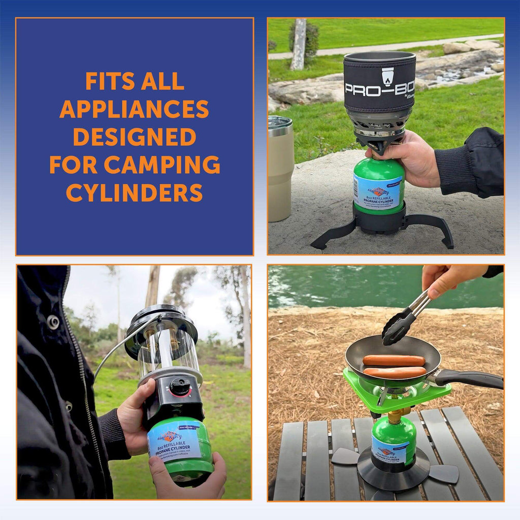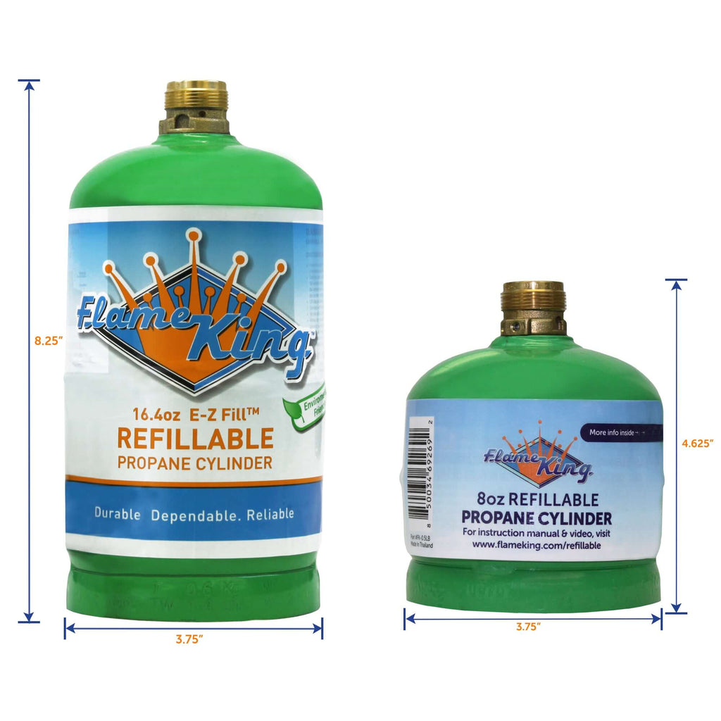 The Flame King 1/2 LB refillable propane cylinders are perfect for small propane lamps and lanterns, camp stoves, welding torches, and cooking torches. These propane bottles are refillable & transportable. Our unique & patented valve design is not available from any other manufacturers. Spend your money wisely & start refilling small cylinders whenever you need them! Tossing a single-use disposable tank is just a silly waste of resources & can be a potentially huge problem in the waste stream! Join the eco-revolution! Please note that these cylinders fill fastest & safest with our commercial Flame King refill adapter - sold separately. High-grade steel construction, X-ray & Hydrostatic tested, powder coated for long-lasting exterior protection and DOT & TC certified for 12 years (10 years in Canada) - UL1769 listed. Flame King refillable propane tanks are the only 1/2LB tanks Certified by the DOT as legally and lawfully refillable and transportable.