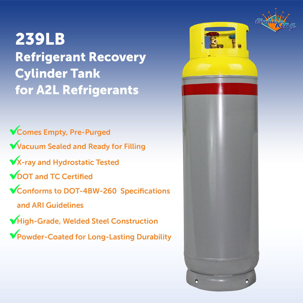 Handle large-scale refrigerant recovery with confidence using the Flame King 239LB Recovery Cylinder. Designed for professionals, this high-capacity tank makes recovering, transporting, and storing refrigerant gases safe, compliant, and efficient.