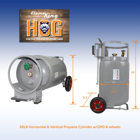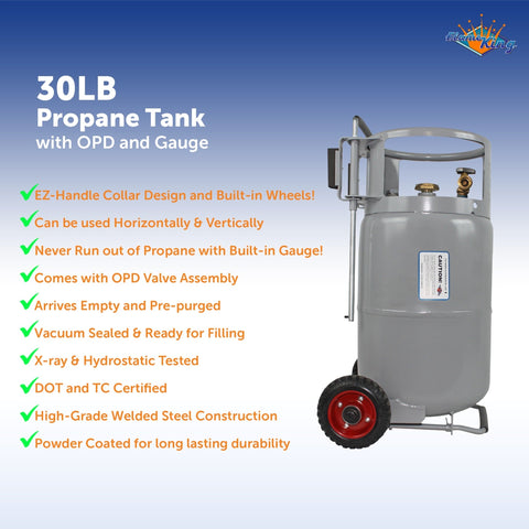 The Flame King 30LB Propane Tank is the perfect solution for all of your propane supply needs. Best for residential and outdoor applications - BBQ/outdoor grilling and cooking, patio/garage heating, fire pits, fire tables, RVs, and truck campers. This can be used horizontally and vertically, and can also be transported in both positions. It has built-in wheels for ease of transport and an EZ-HANDLE collar design, a built-in formed handle with no sharp edges. Propane Tank comes empty, a pre-purged vacuum ready for the filling of propane avoiding the cost and headache of purging your new tank. It has a premium OPD (overfill protection device) valve and a built-in accurate gauge so you will never run out of propane! It is built from high-grade welded steel and powder-coated for rust prevention. For your safety, this tank is X-ray and Hydrostatic tested. You can be sure to transport safely both in the US and CA as it is DOT and Transport Canada certified.