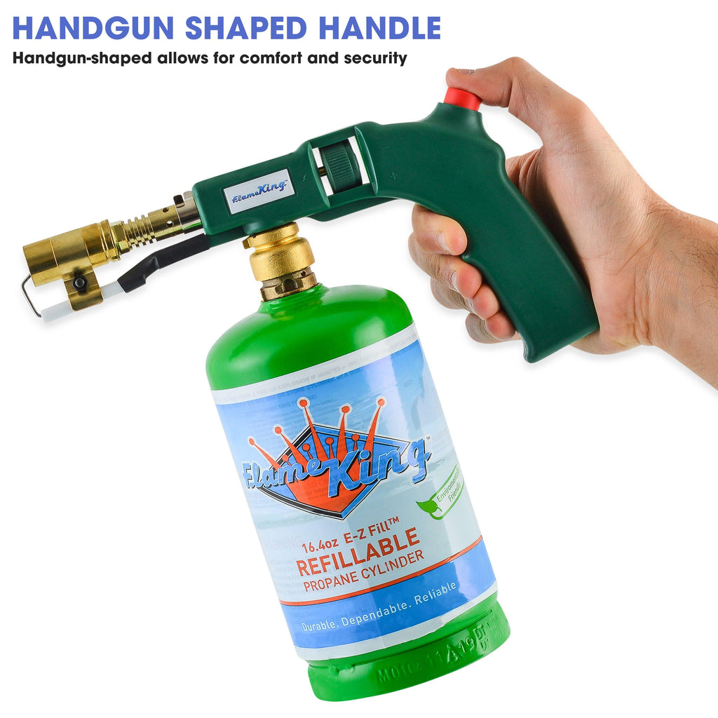The Flame King YSNAX1-085 high-intensity torch head is designed for professional Multi-Purpose welding and includes a self-ignition button that provides easier lighting. The large, optimized swirl flame burns hotter for maximum heat output. The adjustable flame control allows for a more precise flame for various applications and searing. Max heat torch for faster work hours. CGA600 inlet - for use with 1 lb cylinders (not included).