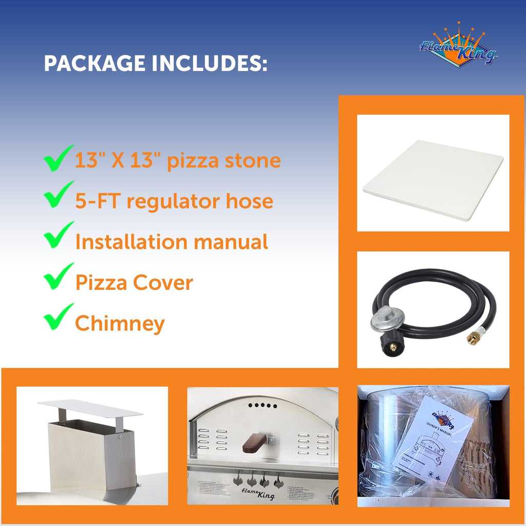 Enjoy cooking the perfect Pizza, Steak, Chicken and so much more with the all new Multi Function Propane Pizza Oven by Flame King! Speed and perfection is the name of the game with the ovens 23,000 BTU heat output to reach a high temperature of 662ºF in 5-7 minutes and finish a pizza with maximum temperature of 1180°F in 60 seconds. The ovens arc shaped chamber furnace is designed to quickly and evenly circulate heat. Get the Multi Function Propane Pizza Oven by Flame King and Happy Cooking!