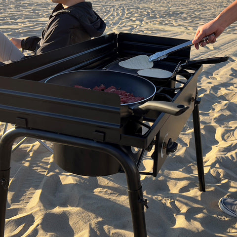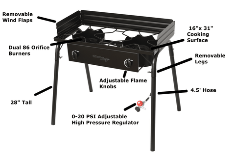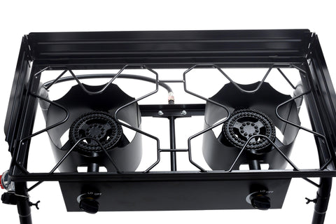 The Flame King Standup 2 Burner Stove is the perfect solution for your outdoor cooking needs. Take it camping with you or have it as an emergency backup in the event of a home power outage. Feel reassured in knowing you can cook in whatever extreme situation you find yourself in. The Flame King Standup stove is a true outdoor appliance with incredible performance capabilities. It has a three-sided windscreen to shield any breeze from getting in the way of your cooking.