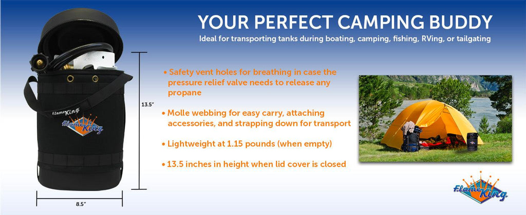 Don't go camping without this great bundle from Flame King! The Flame King GH5-RBH-5LB bundle comes with a 5LB (1.2 gallons) refillable propane tank, a propane rubber hose YSN-QCC-1LB, and a Gas Hauler - an insulated protective carrying case for 5LB tanks. The Gas Hauler is a must-have to protect your tank when transporting during boating, camping, fishing, RVing, or tailgating. Designed with maximum safety, this gas hauler comes with safety vent holes for breathing in case the pressure relief valve needs to release any propane. Gas Hauler also has enough room to carry your propane hose and other accessories. Gas hauler measures 8.5X13 inches; lightweight at 1.15 pounds (when empty); perfectly fits not only the the Flame King 5LB tanks but other other tanks within this size range as well. The molle webbing makes it easy to carry, attach accessories, and strap down for transport. The Flame King 5LB Propane Tank is a pre-purged vacuum ready for the filling of propane avoiding the cost and headache of purging your new tank. It is built from high-grade welded steel and powder-coated for rust prevention. For your safety, your tank comes with an OPD valve to prevent overfilling. It is also x-ray and hydrostatic tested. You can be sure to transport safely both in the US and CA as they are DOT and Transport Canada certified. Flame King's 4-FT propane adapter hose (YSN-QCC-1LB) connects your 1LB appliance to a 5LB propane tank using a QCC1 or Type-1 connection. The hose tethers to the CGA hook on your propane-powered appliances including camping stoves, tabletop grills, lanterns, and more.