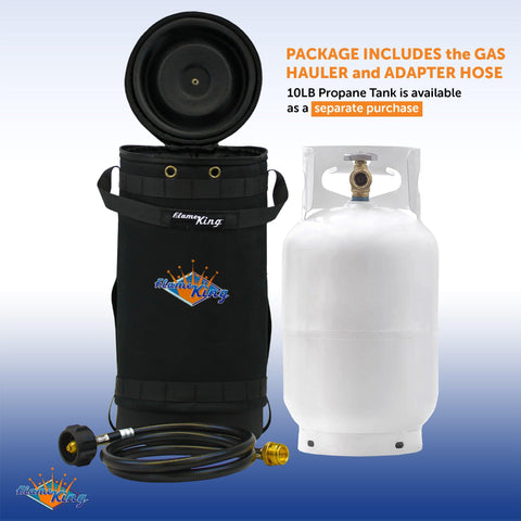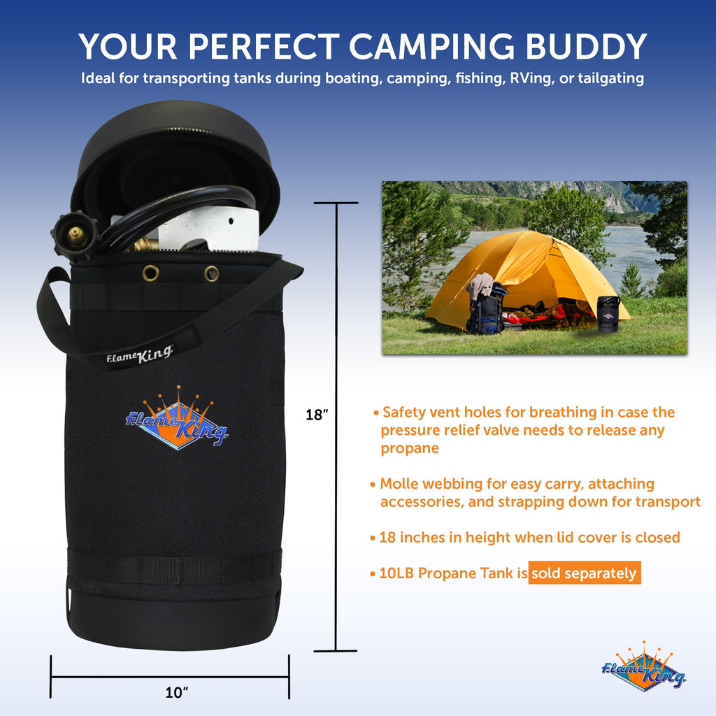 Don't forget to include the Flame King GH10-RBH bundle in your camping essentials checklist! This bundle comes with a propane rubber hose YSN-QCC-1LB and a Gas Hauler - an insulated protective carrying case for 10LB tanks. The Gas Hauler is a must-have to protect your tank when transporting during boating, camping, fishing, RVing, or tailgating. Designed with maximum safety, this gas hauler comes with safety vent holes for breathing in case the pressure relief valve needs to release any propane. Gas Hauler also has enough room to carry your propane hose and other accessories. Gas hauler measures 10X17.5 inches; lightweight at 1.72 pounds (when empty); perfectly fits not only the the Flame King 10LB tanks but other other tanks within this size range as well. The molle webbing makes it easy to carry, attach accessories, and strap down for transport. Flame King's 4-FT propane adapter hose (YSN-QCC-1LB) connects your 1LB appliance to a 10LB propane tank using a QCC1 or Type-1 connection. The hose tethers to the CGA hook on your propane-powered appliances including camping stoves, tabletop grills, lanterns, and more.
