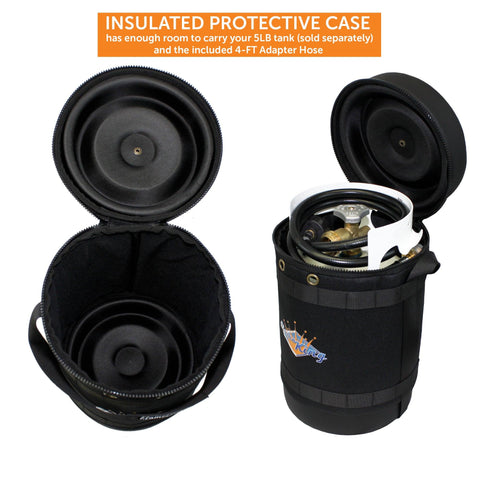 Don't forget to include the Flame King GH5-RBH bundle in your camping essentials checklist! This bundle comes with a propane rubber hose YSN-QCC-1LB and a Gas Hauler - an insulated protective carrying case for 5LB tanks. The Gas Hauler is a must-have to protect your tank when transporting during boating, camping, fishing, RVing, or tailgating. Designed with maximum safety, this gas hauler comes with safety vent holes for breathing in case the pressure relief valve needs to release any propane. Gas Hauler also has enough room to carry your propane hose and other accessories. Gas hauler measures 8.5X13 inches; lightweight at 1.15 pounds (when empty); perfectly fits not only the the Flame King 5LB tanks but other other tanks within this size range as well. The molle webbing makes it easy to carry, attach accessories, and strap down for transport. Flame King's 4-FT propane adapter hose (YSN-QCC-1LB) connects your 1LB appliance to a 20LB propane tank using a QCC1 or Type-1 connection. The hose tethers to the CGA hook on your propane-powered appliances including camping stoves, tabletop grills, lanterns, and more.