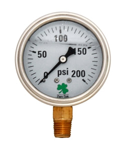 Zenport LPG200 Zen-Tek Instruments liquid glycerin filled 0-200 psi pressure gauge is an excellent choice for vibrating environments, such as around working machinery and is built with a 2.5-inch diameter ABS case with 372 plastic window, 1/4 NPT brass bottom connection and brass internal mechanism. Glycerin helps prevent icing and moisture penetration. This gauge is great for use with water systems, air tanks, oil systems and more. This quality gauge features grade A accuracy (1.6%) and features a high visibility dial and number readout.