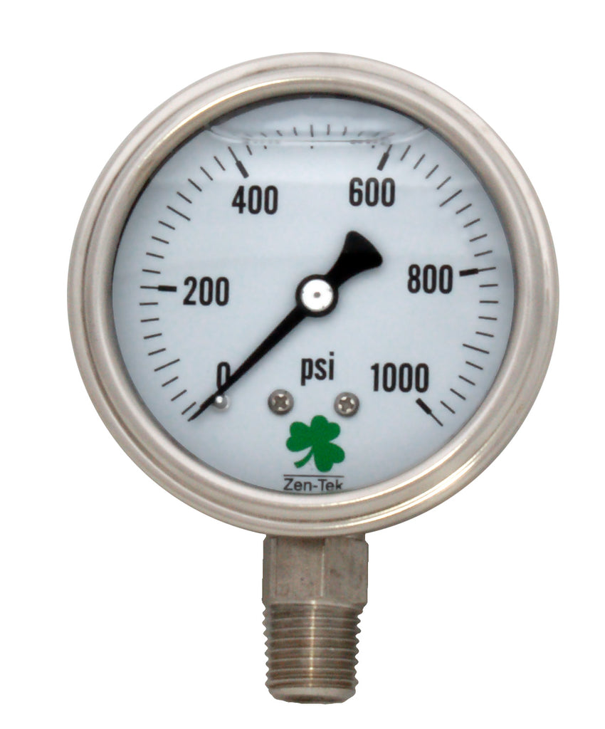 Zenport Zen-Tek Instruments SSLPG1000 stainless steel liquid filled 0-1000 psi pressure gauge is an excellent choice for vibrating environments, such as around working machinery and is built with a 2.5-inch diameter ABS case with 372 plastic window, 1/4 NPT stainless steel bottom connection and stainless steel internal mechanism. Glycerin helps prevent icing and moisture penetration. This gauge is great for use with water systems, air tanks, oil systems and more. This quality gauge features grade A accuracy (1.6%) and features a high visibility dial and number readout.