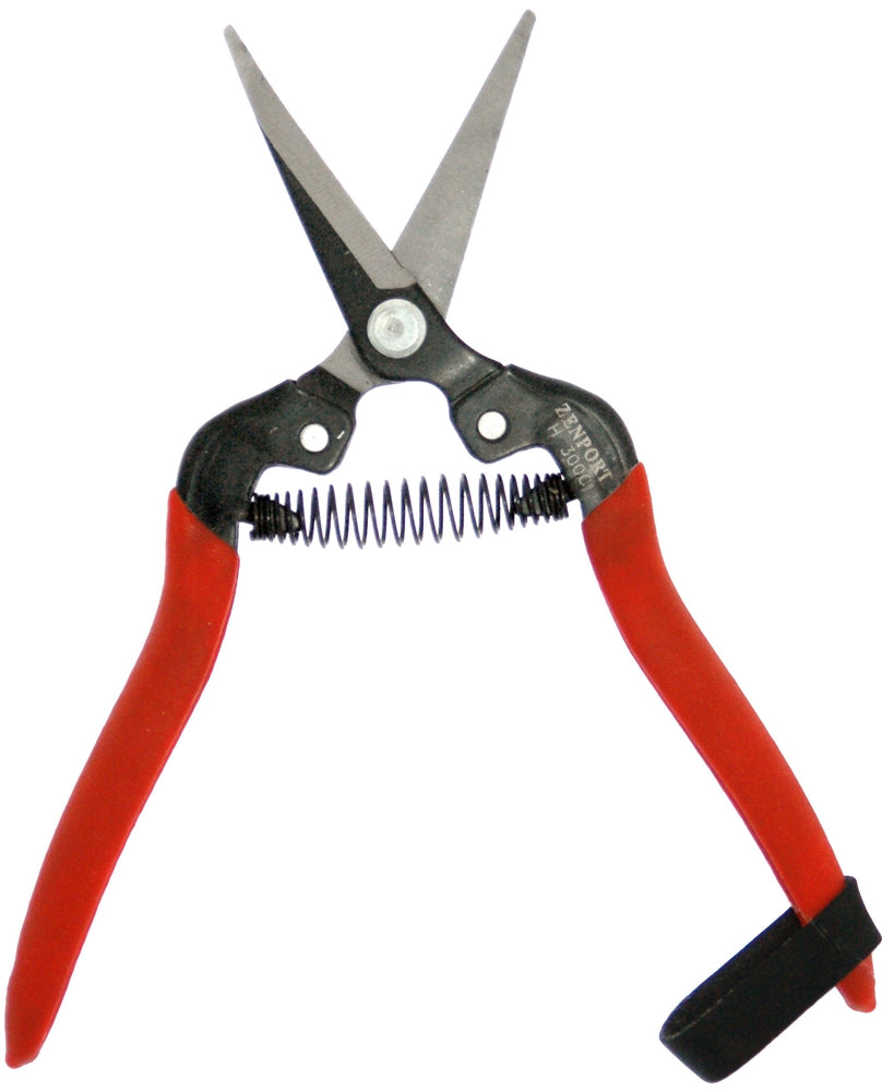 Zenport Shears H300C curved, long, straight edge, heat treated carbon steel, blades are coated to resist rust and corrosion, making them excellent for vineyard grape harvesting, thinning and floral applications. Long handles, with comfortable, non-slip grips, provide excellent control and leverage. Spring loaded action automatically opens blades after each cut; blades lock closed when not in use. Overall length of 7.25-inches (184mm).
