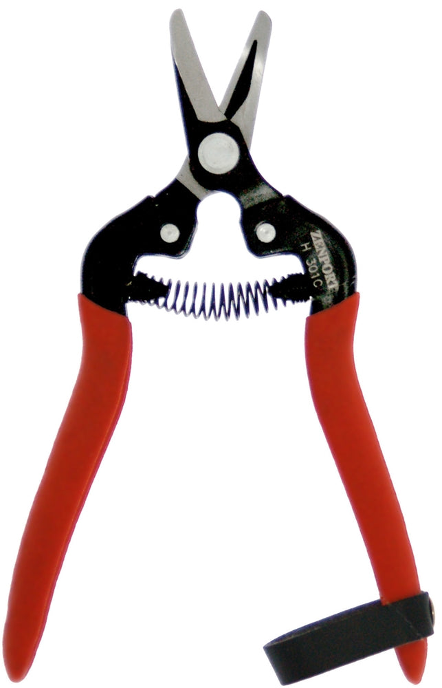 Zenport Shears H301C fruit harvest shears, short curved, heat treated carbon steel blades with a special coating to resist rust and corrosion making an excellent choice for harvesting the most delicate fruits, thinning and floral applications. Long handles, with comfortable, non-slip grips, provide excellent control and leverage. Spring loaded action automatically opens blades after each cut; blades lock closed when not in use. Overall length of 5.25-inches (133mm)