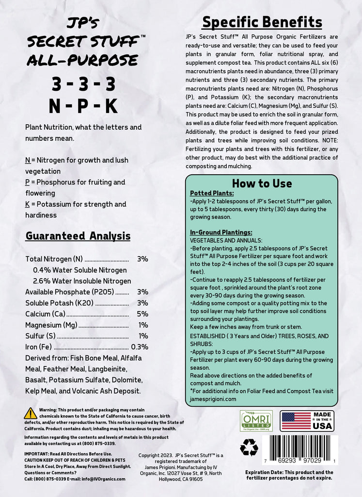 Unlock the secret to thriving plants with JP’s Secret Stuff™ All Purpose Organic Fertilizer, now available at Team Grow. This versatile fertilizer can be used as a granular feed, foliar nutritional spray, or a compost tea supplement. It's packed with all six essential macronutrients, including three primary (Nitrogen, Phosphorus, Potassium) and three secondary (Calcium, Magnesium, and Sulfur) nutrients. It is ideal for enriching soil, boosting plant health, and improving overall soil conditions.