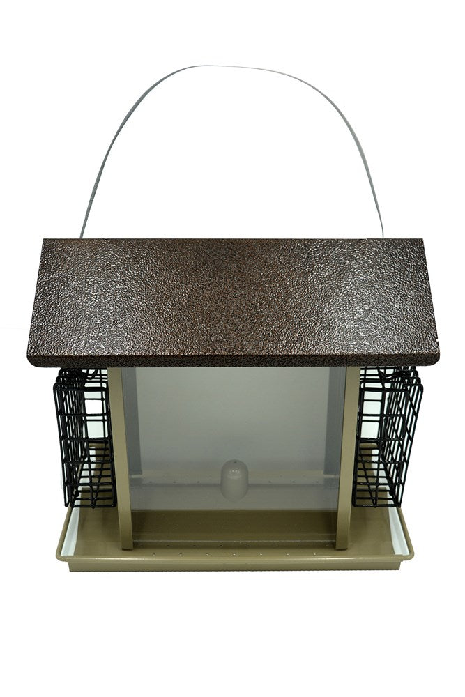 Large hopper feeder with suet holders. Holds over 6 quarts of seed and two suet cakes. Seed diverter and drainage holes help keep seed fresh. Large perching area provides space for multiple birds to feed and watch others. Built-in socket to mount to Stokes bird feeder pole. Rooftop design helps to keep seed dry from rain or snow.