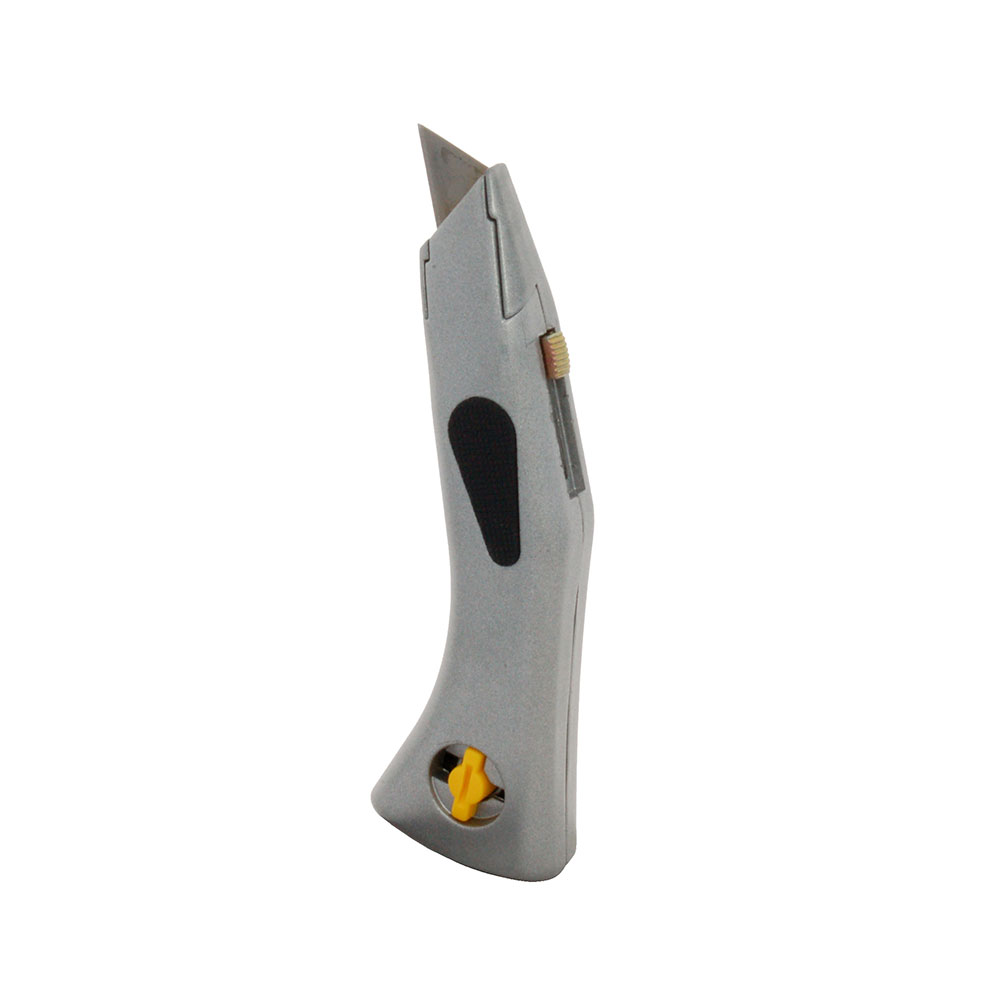 The Zen-Tek UK309 heavy duty utility knife. Features an aluminum casing, retractable blade with 3-blade positions, and a non-slip rubber grip handle. Replaceable blade. 7.5-inch overall length.