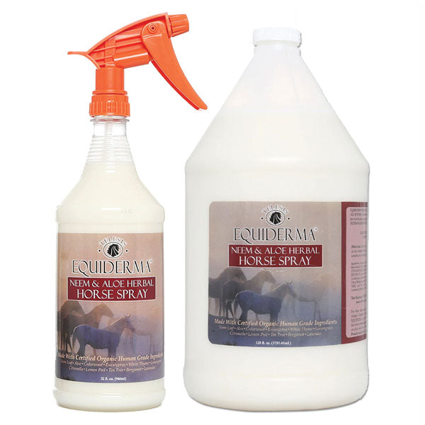 Equiderma Horse Spray has a unique combination of botanical oils, neem and aloe that will repel biting and blood-sucking insects, control future insect populations and protect your animal's skin from fungal and bacterial skin diseases. The 8 oils in this spray (Neem, Red Cedar, Eucalyptus, Lemongrass, Citronella, Lemon Peel, Tea Tree and Lavender) combine to create a powerful repellent with a pleasant, citrusy scent.