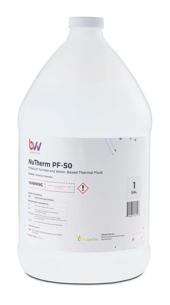 NuTherm PF-50 is a high-performance heat transfer fluid designed as an alternative to less effect fluid such as glycol, PAG, and Calcium Chloride open bath fluids. Nutherm PF-50 is NON-Toxic, NON-flammable, and has a robust corrosion inhibition package making it ideal for use in open bath systems down to -51°C(-60°F).