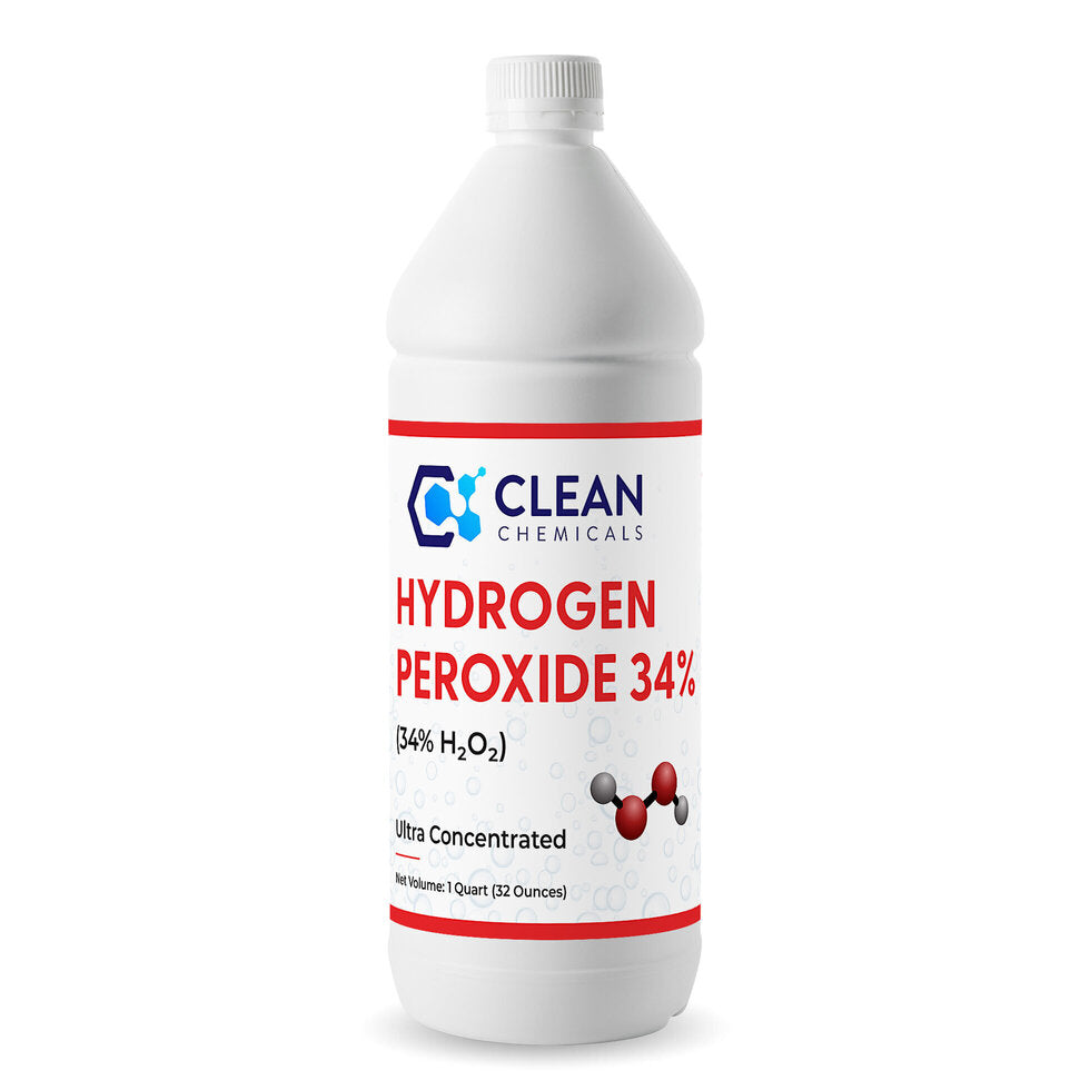 Safety and Handling: Hydrogen Peroxide 34% is hazardous and should be handled with caution. It is a strong oxidizer capable of causing severe skin and eye irritation or burns. Use gloves, goggles, and proper ventilation when handling. If contact occurs, flush with water immediately and seek medical attention.