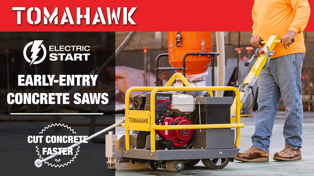 The Tomahawk Power 10” Green Concrete Early Entry Saw cuts concrete slabs in one clean sweep. Avoid damage to your fresh concrete pour and enjoy the durability and performance of the new TFS10H.