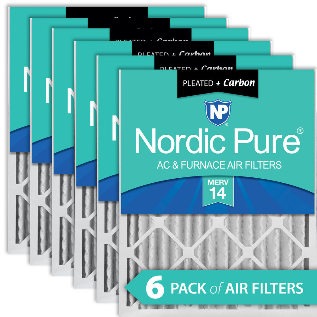 Nordic Pure 16x20x4 Plus Carbon Air Filters MERV 14 are made of electrostatically charged synthetic materials with an added flat panel infused with activated charcoal that will attract and capture most airborne particulates in your home. It will help eliminate unwanted odors as well as trap most airborn dust and particle matter for fresh, clean air. Odorus gases and vapors (VOC) are attracted to and held by the activated carbon material while maintaining excellent air flow properties. With each pass through the carbon furnace air filter, the air in your living environment improves. Each time air passes through a Nordic Pure pleated furnace filter, lint, household dust, pollen, dust mites, pet dander, smog, smoke particles, virus carriers, bacteria, allergens, mold spores and other contaminants are removed. All Nordic Pure pleated air filters are manufactured using a heavy duty, moisture resistant beverage board frame. There is a metal mesh support grid bonded to the pleats for extra support. Our carbon AC filter media prevents the growth of bacteria or mold, resulting in a much healthier living environment.