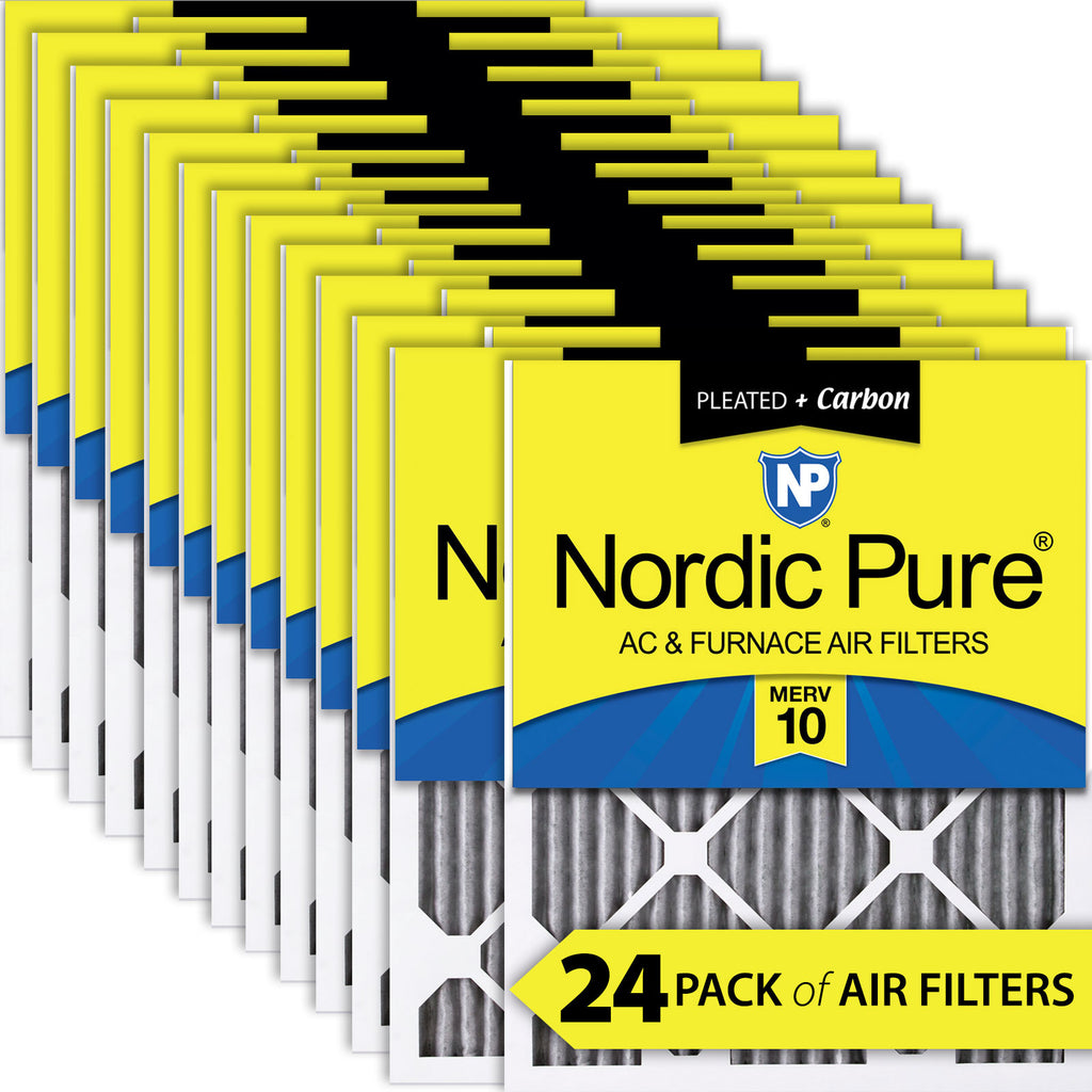Our high efficiency activated carbon AC filter helps eliminate smoke particles, lint, household dust, pollen, dust mites, pet dander, virus carriers, allergens, bacteria, mold spores and other contaminants. All Nordic Pure pleated air filters are manufactured using a heavy duty, moisture resistant beverage board frame. There is a metal mesh support grid bonded to the pleats for extra support. Our air filters use permanently electrostatically charged material that acts like a magnet to help dust cling to the air filter. Our Nordic Pure anti-microbial air condition filter media will not permit the growth of bacteria or mold resulting in a healthier environment. MERV 10 Plus Carbon air filters are comparable to air filters with the rating of MPR 900-1000. This high-performance HVAC replacement filter will outperform non-electrostatic fiber-glass filters, washable filters, poly disposable filters, and will help keep your air conditioning and heating systems running efficiently, saving money on utilities and costly maintenance.