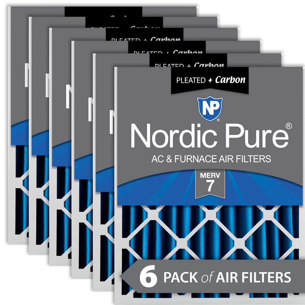 Nordic Pure 20x24x4 MERV 7 Plus Carbon air filters are made of electrostatically charged synthetic materials with an added flat panel infused with activated charcoal that will attract and capture most airborne particulates in your home. It will help eliminate unwanted odors as well as trap most airborne dust and particulate matter for fresh, clean air. Odorous gases and vapors (VOC) are attracted to and held by the activated carbon material while maintaining excellent air flow properties. Each time air passes through a Nordic Pure carbon pleated furnace filter, lint, household dust, pollen, dust mites, pet dander, bacteria, mold spores and other contaminants are removed. All Nordic Pure + carbon pleated air filters are manufactured using a heavy duty, moisture resistant beverage board frame. There is a metal mesh support grid bonded to the pleats for extra support. Our AC filter media prevents the growth of bacteria or mold, resulting in a much healthier living environment.