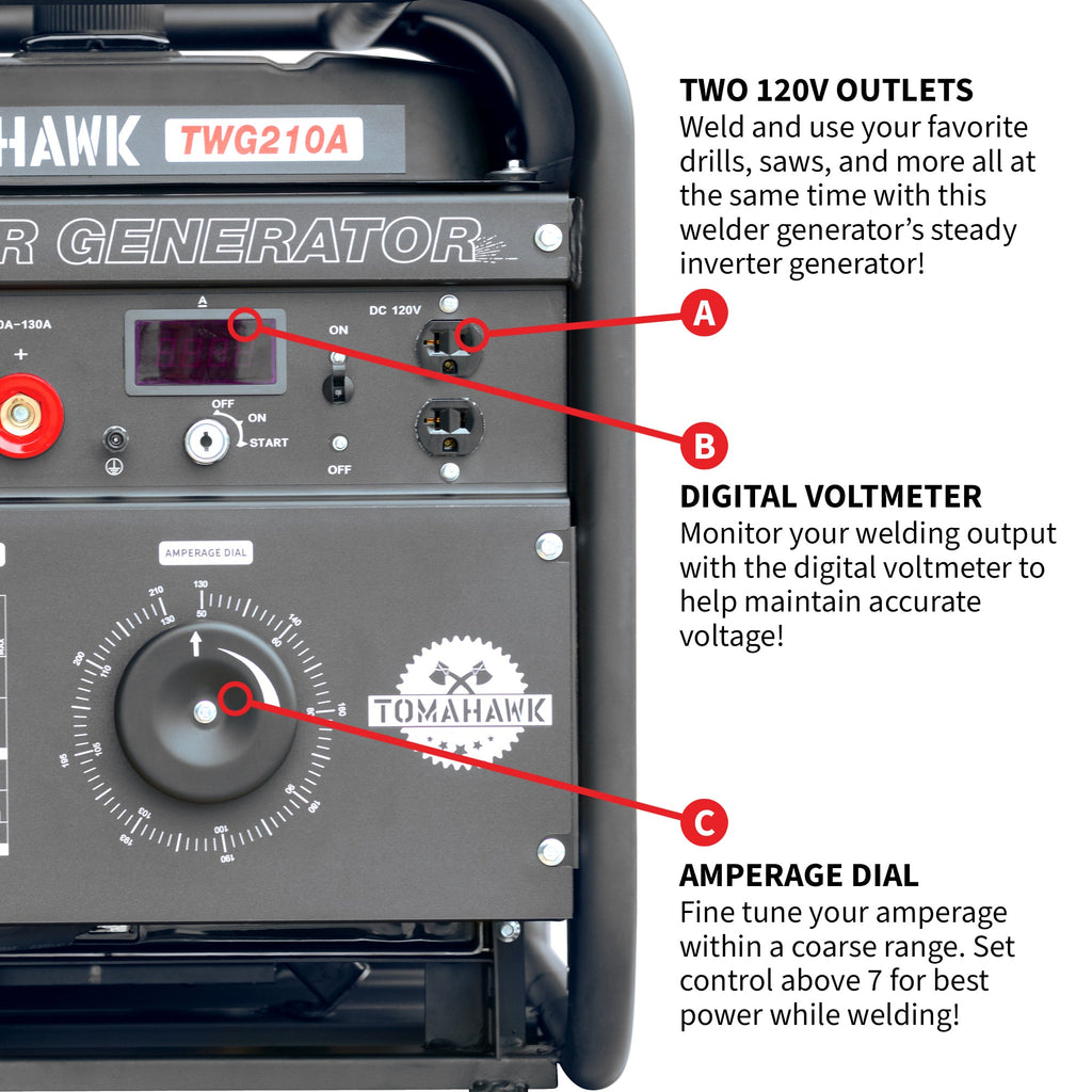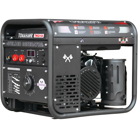 The Tomahawk TWG210A Generator / Welder is designed for high power and durability. Ideal for farms, construction sites, or any job that requires electrical power and CC (constant current) stick welding. Producing up to 210 Amps with a 60% duty cycle, it is suitable for welding from 6010 rods up to 7024 rods. Convenient back wheels allow for maneuverability for portable onsite welding and can also be used for emergency back-up power when necessary. Featuring Tomahawk’s incredible 15HP engine, with 2000 watts, this welder generator will provide you with the power you need wherever you need it. The Tomahawk TWG210A is an excellent tool for job applications at your workshop, ranch, or farm - and is backed by a 2-year engine warranty.
