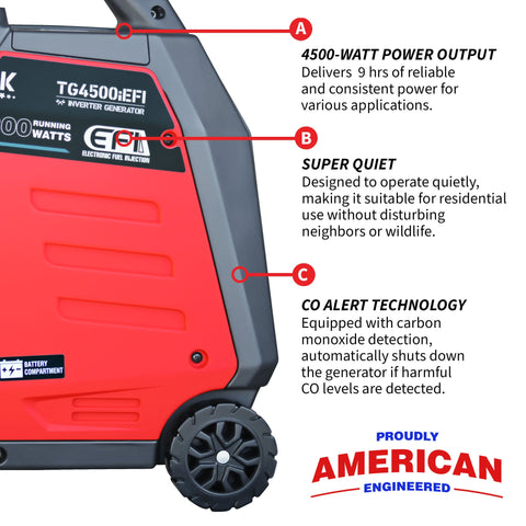 - 4500-Watt Power Output: Delivers reliable and consistent power for various applications, from emergency backup to outdoor activities.