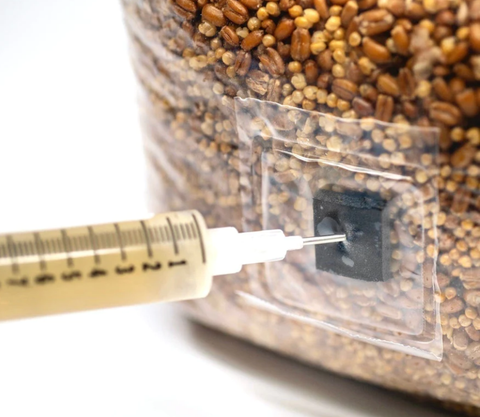 To inoculate the grain bag, simply inject your spore or culture syringe through the port in a sterile location. We always recommend clean hands and latex or nitrile gloves to reduce the introduction of contaminants.