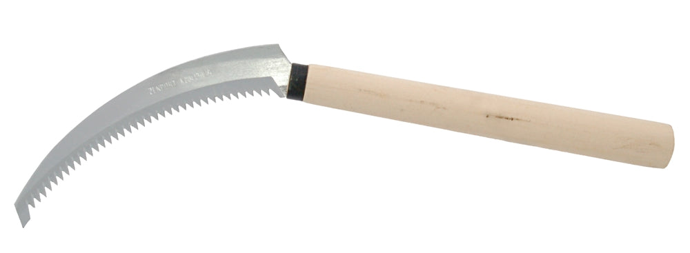 Curved 6.5-inch stainless steel blade with deep serrations Lightweight rugged wooden handle. Great tool for row crop harvesting, trimming, landscape and weeding applications.