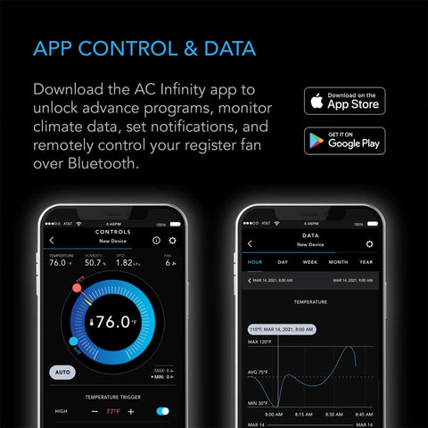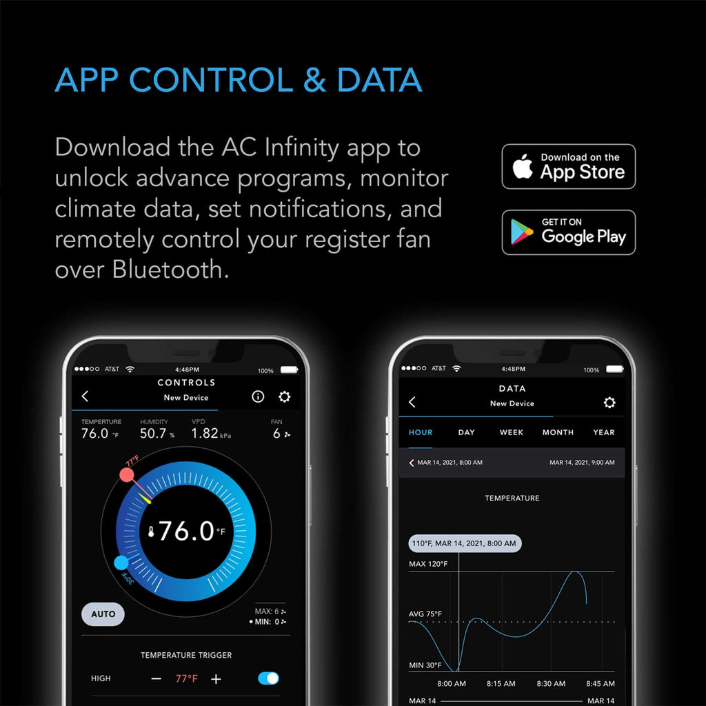 • Intelligent Programming: The onboard controller comes equipped with active thermal monitoring. It uses temperature-based triggers to activate this register fan when certain heating or cooling thresholds are reached. The fans are kept running at low speeds consistently to provide steady airflow, and timer and cycle modes allow for customized activation. The device can be securely connected to the AC Infinity app via Bluetooth, offering control automation. Additionally, you can remotely access your devices, unlock advanced settings, set alarms and notifications, view past data, and export CSV data.