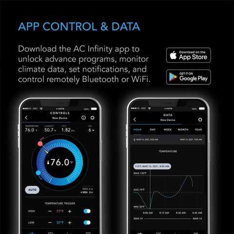 Intelligent Programming: With its programmable triggers, two outlet devices can be powered on or off due to changes in temperatures, humidity, and VPD levels. The buffer settings are adjustable to customize devices' reactions to climate changes. The timer, on/off cycle, and schedule modes add custom on-demand activation for various uses. The controller possesses backup memory to maintain settings even if it loses power. It securely connects with the AC Infinity app via Bluetooth or WiFi for remote access, unlocking advanced programs, setting notifications, viewing historical climate charts, and exporting CSV data.