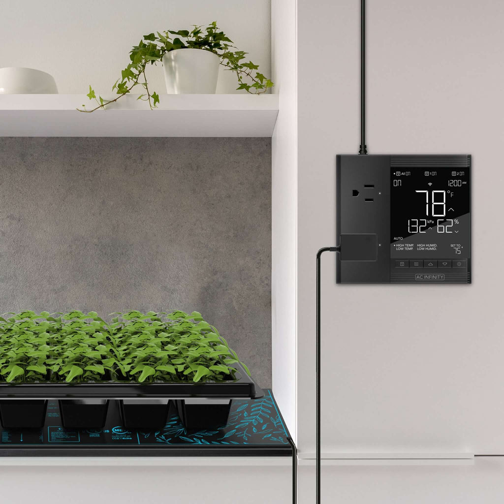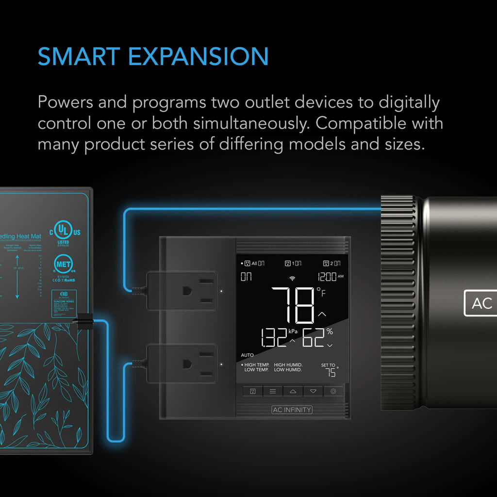 Compatibility: This smart outlet controller is equipped with two outlets to power and distribute unique programming to two devices, supporting up to 1100W. It can be utilized to automate cooling and airflow production with devices such as inline duct fans, shutter exhaust fans, or clip-on oscillating fans. Other compatible devices include seedling heat mats for applications such as homebrewing and fermenting beverages, warming terrariums, or starting, germinating, and propagating seeds.