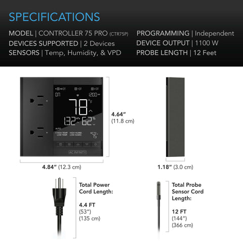 Product Description: The digital outlet controller is designed to provide multiple devices with independently programmed temperature, humidity, VPD, and time-based controls. It features a large backlit LCD display with climate readings and settings that are switchable between Fahrenheit and Celsius. The package includes a 12-foot sensor probe with a waterproof thermal-alloy head for accurate detection of current temperature, humidity, and VPD conditions. The controller’s two outlets are capable of powering devices up to 1100W combined, hence, automating their programming.
