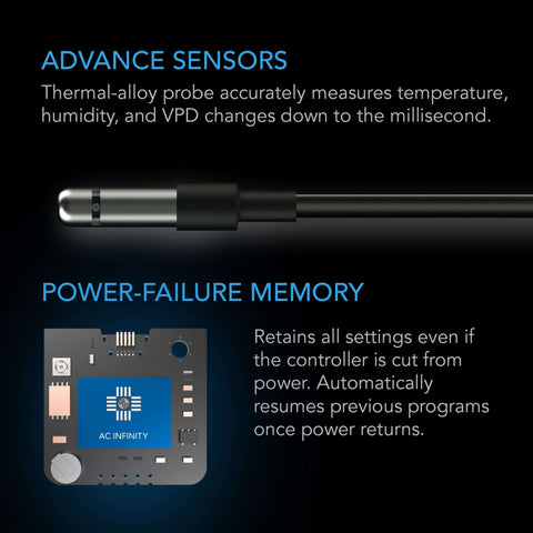 Intelligent Programming: It features programmable triggers that power two outlet devices to turn on or off in response to temperature, humidity, and VPD levels. Adjust buffer settings to customize how they react to climate changes. Timer, on/off cycle, and schedule modes add custom on-demand activation for a variety of uses. Backup memory retains settings even if the controller is cut from power. Securely connect with the AC Infinity app via Bluetooth or WiFi to access your outlet controller remotely, unlock advanced programs, set notifications, view historical climate charts, and export CSV data.