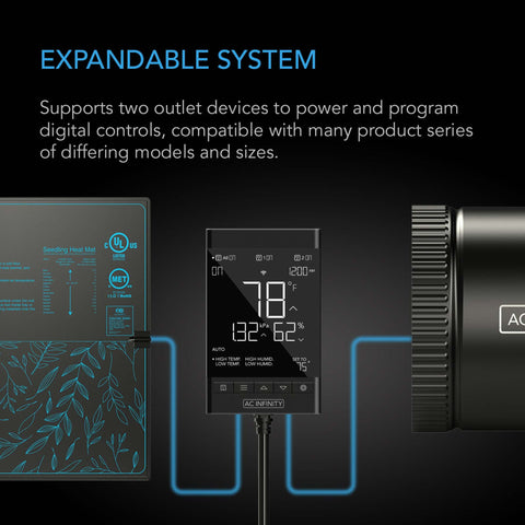 Compatibility: This smart outlet controller is equipped with two outlet sockets to power and distribute unique programming to two devices, supporting up to 1100W. Plug devices with AC power plugs in such as inline duct fans, shutter exhaust fans, or clip-on oscillating fans to automate cooling and airflow production. Other compatible devices include seedling heat mats to activate heating for homebrewing and fermenting beverages, warming terrariums, or starting, germinating, and propagating seeds.