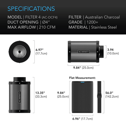 4" Inline Filter: Crafted to contain odors and chemicals within grow tents and hydroponics rooms. It features top-notch Australian charcoal known for its superior adsorption and extended lifespan.