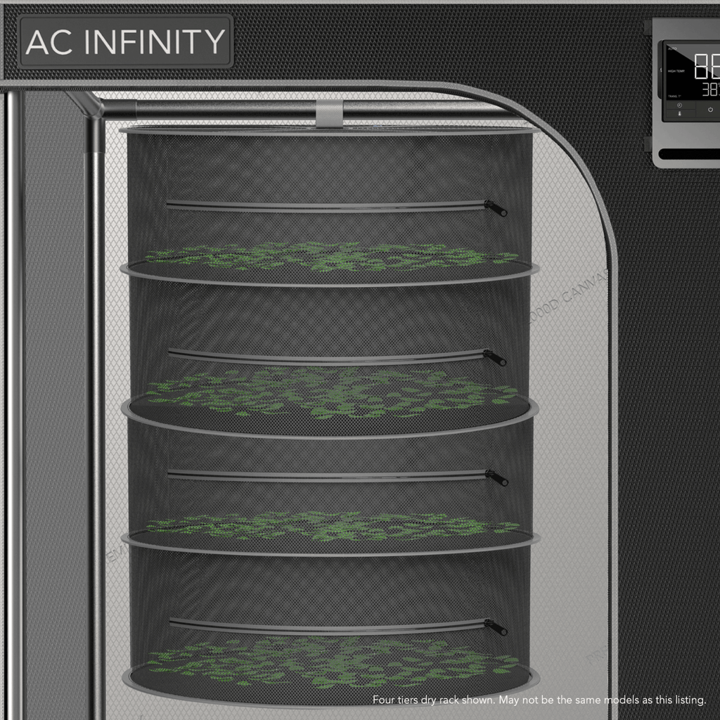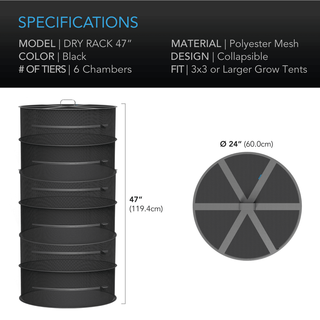 Product Dimension: The rack consists of 6 tiers and measures 24 inches in diameter. It is designed to fit 3x3 or larger tents and comes with an included hanging hook & carrying bag for a holistic experience.