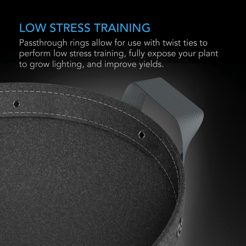 Applications: The bags' sturdy handles facilitate uncomplicated transportation, while their inbuilt metal rings enable plant hanging. The twist ties create a route for low-stress training. The heavy-duty, rugged construction withstands wear and tear and is machine washable for repeated use. Each planter accommodates a comparatively larger soil volume when filled up to the dual stitch line, offering plants more root space to thrive in.