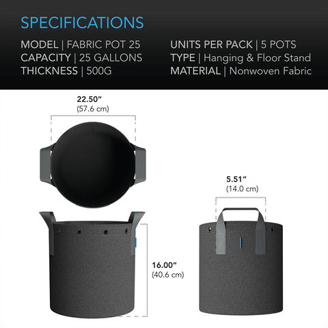 Product Specifications: Each bag has a true capacity of approximately 27.54 gallons. The fabric has a thickness rating of 500G. The package includes a set of 5, BPA-free garden grow bags.