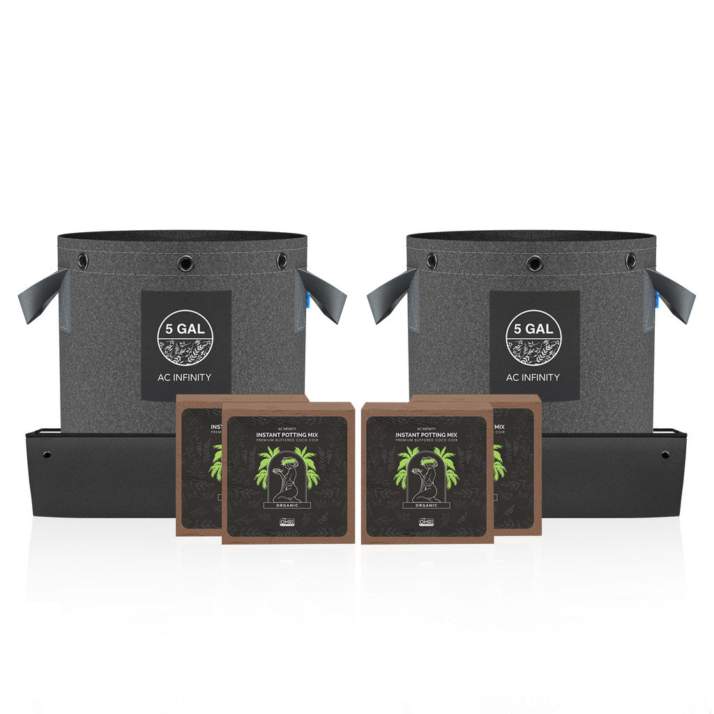 A plant potting kit that includes everything you need to start seeds with a greater success rate. By using this package, you can quickly assemble a seed-friendly environment that will facilitate germination and ensure a successful indoor grow. This bundle includes four bricks of premium buffered coco coir that is 100% organic, two 5-gallon fabric pots, and two waterproof drip trays. Just add water to the coco coir brick and wait up to 30 minutes to get a pH-neutral soil substitute that aids in healthy root development. This substrate can be held in the included 5-gallon fabric pot, made to improve root networks by air-pruning root tips and draining excess water. Place the fabric pot in the multipurpose tray that can be used as a hydration chamber to expand the coco coir while keeping your grow space tidy.