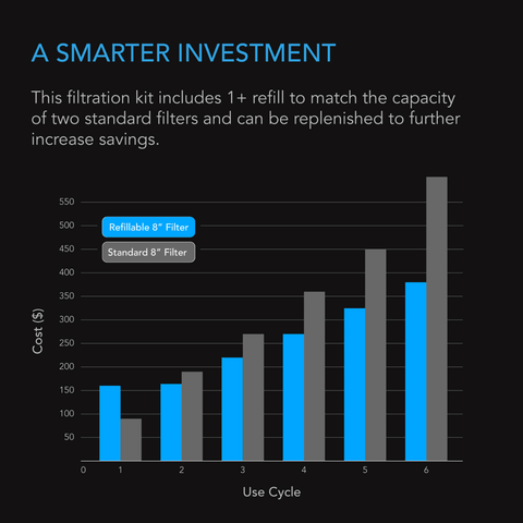 Eco-Friendly Design: This unique first-of-its-kind filtration system is designed to remove the need to routinely purchase and dispose of replacement filters. Each carbon filter utilizes premium-grade Australian virgin charcoal and includes over one refill. The activated charcoal features an enhanced surface area with a higher adsorption rate to help extend the time between refills. You can further extend the charcoal bedding's lifespan by reversing the filter's easily removable flanges. The used supply can be composted when replacing the charcoal to maximize its use even more.