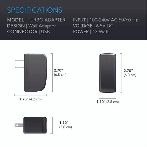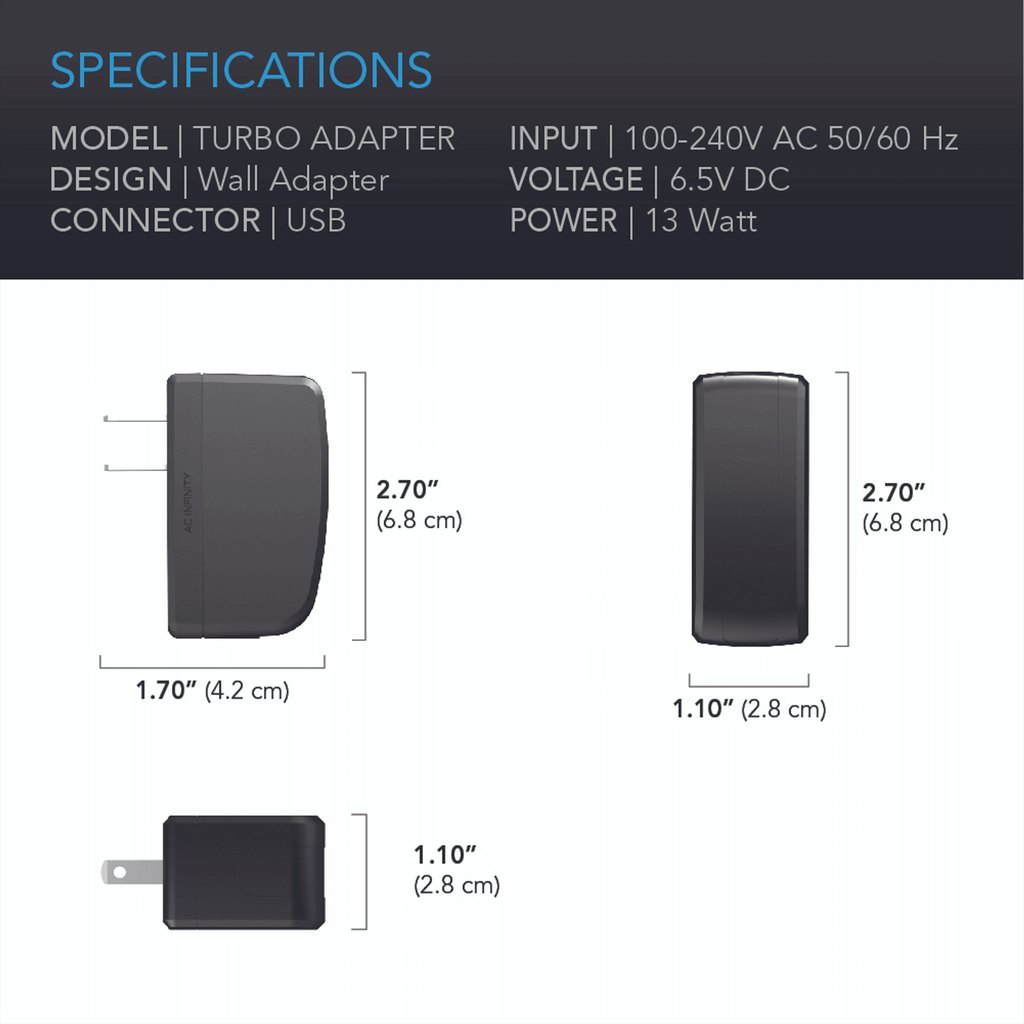 • Designed for MULTIFAN fans and other AC Infinity USB fans. This Turbo Fan Wall Adapter enables approved fans to be powered through a standard wall outlet, providing a convenient power source.