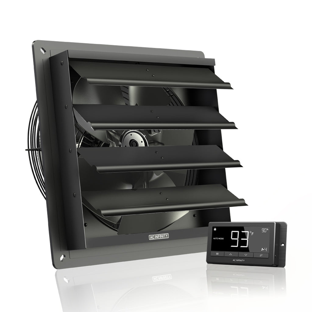 A high-airflow exhaust fan designed to cool and ventilate greenhouses, garages, attics, workshops, and sheds. The system can automatically eliminate heat, moisture, odor, and dust from enclosures, rooms, and buildings. Features an LCD display with remote smart temperature and humidity sensors, as well as customizable fan speeds. Innovative EC-motor with PWM-control maximizes airflow while reducing energy consumption and noise levels. Heavy-duty build features aluminum blades, steel wire guards, and steel shutters. Includes everything needed to mount the fan unit and power it through an outlet.