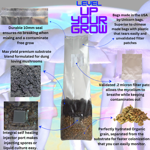 Whether you are new to the hobby or an experienced veteran, these all in one mushroom grow bags are the perfect choice. Experience higher success rates, great yields, and ease of use.