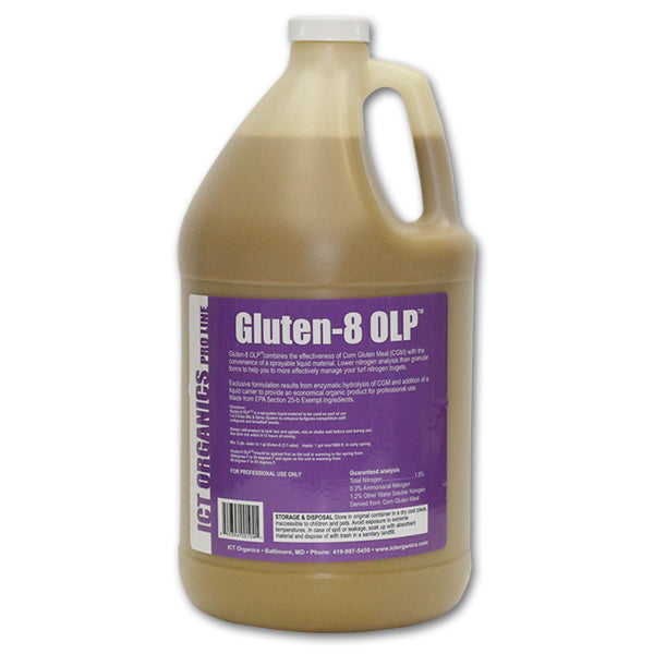 Gluten-8 OLP Liquid Corn Meal is an easy to apply pre-emergent weed control with 1.5% nitrogen to feed your soil. This pre-emergent is derived from corn gluten meal, water-soluble and provides effective, economical pre-emergent control of annual grasses and broad leaf weeds without the effort of applying the granular corn gluten.