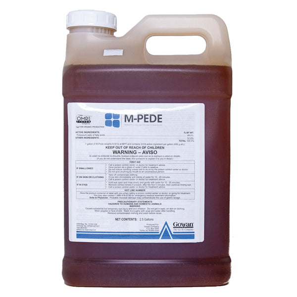 Use as a foliar spray to control or suppress soft bodied pests which include: Adelgids, Aphids (Aphididae), Caterpillars (Lepidoptera), Chinch Bugs (Blissidae), Earwigs, Gypsy Moths (Dermaptera), Lace bugs (Tingidae), Leafhoppers, Leafminers, Mealybugs, Mole Crickets (Neoscapteriscus sp.), Plant Bugs, Psyllids (Hemiptera: Psylloidea), Sawfly Larvae (Hymenoptera), Scale, Spider Mites (Tetranychidae), Stink Bugs, Tent Caterpillars, Thrips (Thysanoptera), and Whiteflies (Aleyrodoidea).M-Pede is most effective on Mites, Aphids and Whiteflies. Effects on other pests are limited to early growth stages and eggs. This product also provides curative control of powdery mildew.