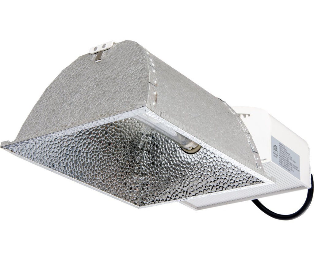 The ARC CMH 315W system is a complete, low-profile 315W ceramic metal halide lighting system designed for commercial growers needs. It features massive thermal heat distribution fins on the ballast compartment to allow the internal electronic components to operate at optimal temperature range, ensuring long ballast life. The replaceable reflector was specifically designed to distribute the CMH lamp’s PPF (Photosynthetic Photon Flux) in a rectangular, traditional spread, yielding very high delivered µmol/s when positioned closer to the canopy and a wider distribution of plant-usable energy when raised higher.
