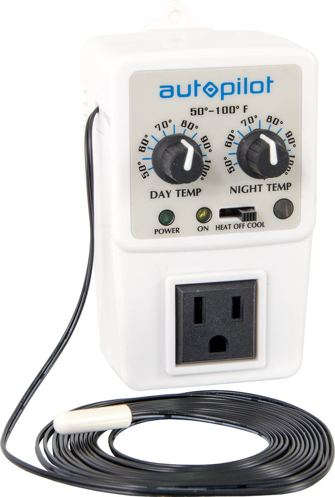 The APCET is a temperature controller that can be used as a cooling OR a heating controller. Once the APCET is connected to a power source, and the cooling or heating device is connected to the APCET's power outlet, the device connected will be automatically controlled by the settings on the APCET. The user can choose to have different day and night temperature settings which will be automatically switched to the correct mode by the built-in photocell. The knobs make it easy to adjust the settings and provide a quick visual verification of the current set points. The LEDs on the front of the unit will turn on and off to show the user the APCET's current operating status.