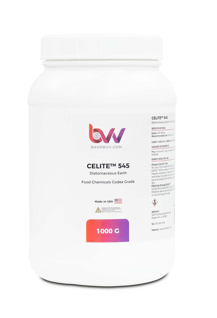 Celite 545 is a formulation of Diatomaceous Earth that is used as a filtration aid for the pre-processing of distillate. Diatomaceous earth is considered skeletal remains of single-celled algae/diatoms formed due to sedimentary deposits. This filtration aid is used in laboratory settings and is a surface-active filtration agent that causes abrasion and the adsorption of other materials such as plant lipids. Celite 545 or Diatomaceous Earth is also an effective, safe alternative to chemical pesticides. This ultra-fine powder should be used with the proper safety equipment and should not be inhaled due to the risk of causing respiratory damage.