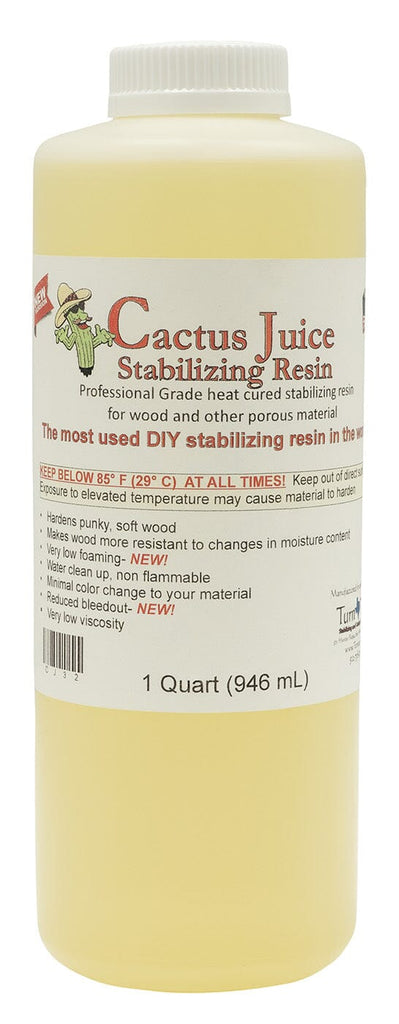 Cactus Juice Stabilizing Resin is the original premium professional grade heat cured resin for stabilizing and hardening wood and other porous material. This makes the wood harder, and much more resistant to moisture. It is especially effective on those beautiful, punky, spalted woods that are just too soft to work with! Cactus Juice is easy to use and does not significantly change the color of most woods. It is NOT solvent-based and cures 99.99% from liquid to solid by weight, far superior to typical home stabilizing solutions such as Minwax Wood Hardener or polyurethane. Stop throwing away those punky blanks and give Cactus Juice a try!