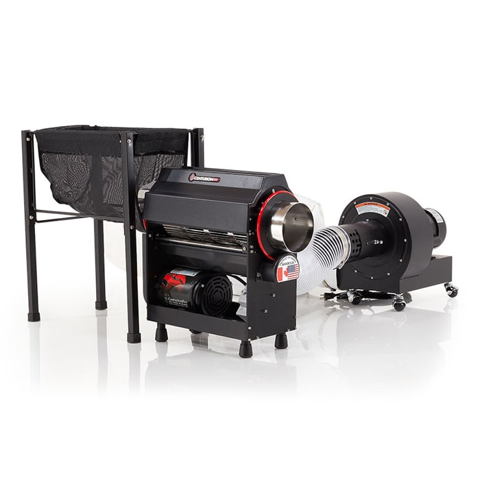 Don't be fooled by the size, the Tabletop Pro replaces over 6 human trimmers without sacrificing quality. This trimmer is currently being shipped World Wide to small growers who demand quality, durability, and privacy. This machine works with wet flowers and will harvest 15-20 lbs wet per hour of use. The Tabletop Pro runs completely off 120v power and comes with a strong 1hp leaf collector with 1800 CFM of suction power.